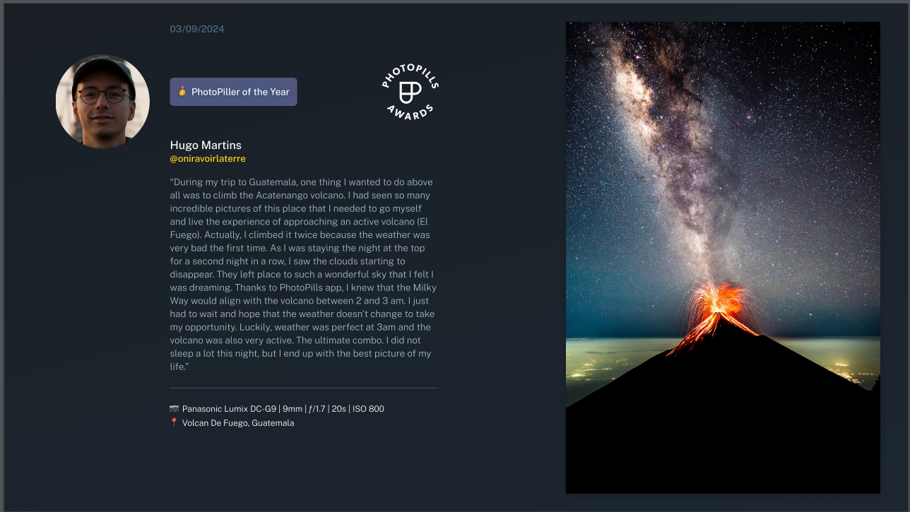 Este año, el PhotoPiller of the Year y ganador de los 3.000$ es Hugo Martins, por su fantástica foto de la Vía Láctea sobre el volcán activo el Fuego en Guatemala.