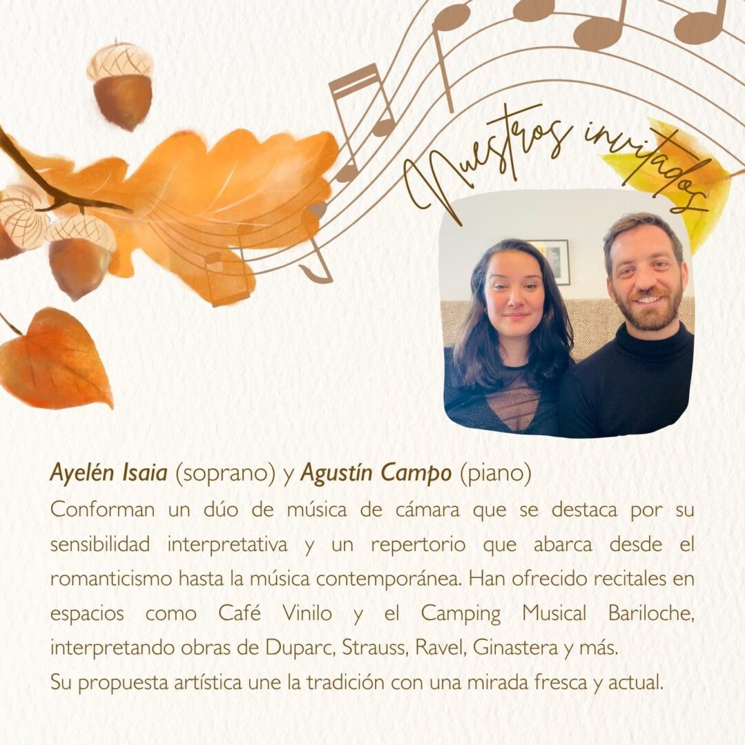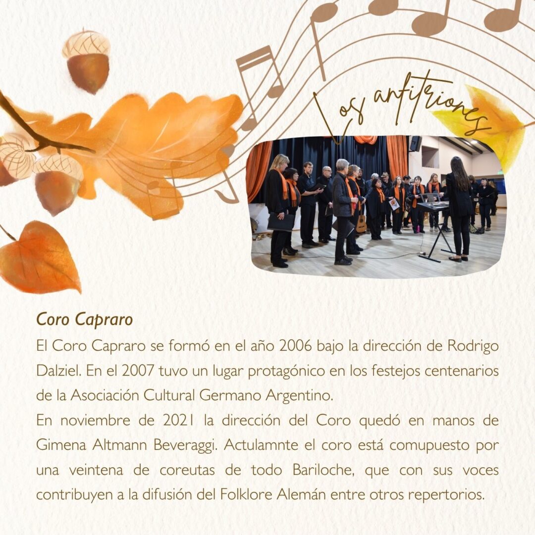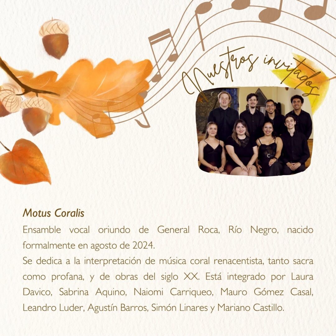 Como cada año en esta época, el encuentro “Otoño Coral Bariloche” en el Instituto Primo Capraro, los invita a participar de la velada de magia y sensibilidad que nos ofrecen estas agrupaciones corales de la ciudad quienes, bajo la dirección de Gimena Beveraggi al frente del Coro Capraro y de la Agrupación Coral Cantores de Bariloche; también disfrutaremos de distintos invitados como, Motus Coralis de Roca, la compañía del Trío “Pinot Noir” y el dúo formado por Ayelén Isaia -Soprano- y Agustín Campo -piano- harán que vuelvan a sus casas con el alma abrigada y flotando de melodías.
