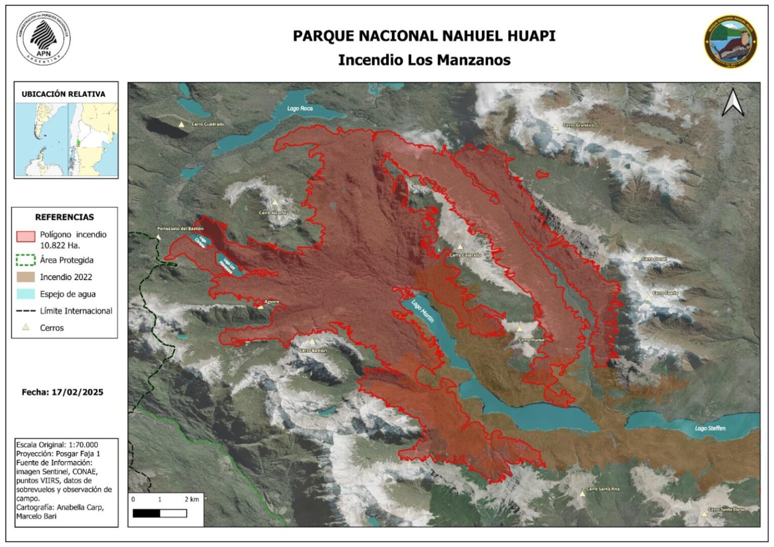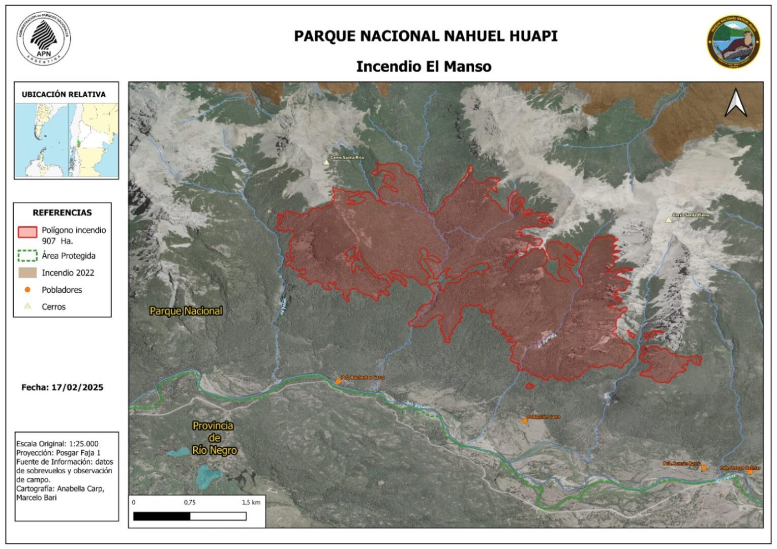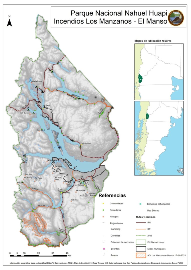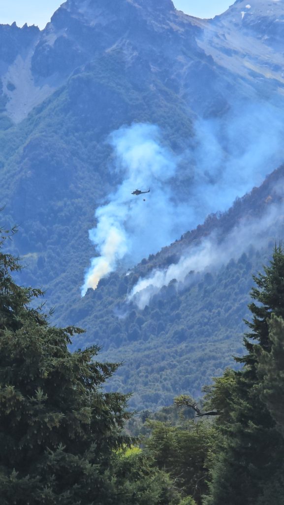 El incendio se mantiene activo. Los sectores de mayor actividad se encuentran próximos a la zona de Cascada los Alerces, Los Manzanos al límite con Chile y en El Manso sobre el Cerro Santa Elena dentro del Parque Nacional.