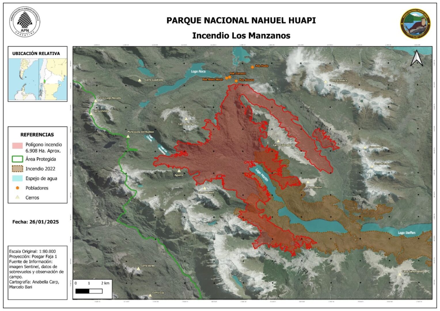 El incendio en el Parque Nahuel Huapi continúa activo, con un perímetro actualizado ayer a 6908 hectáreas, cifra que se ajustará tras las evaluaciones de sobrevuelo de hoy.