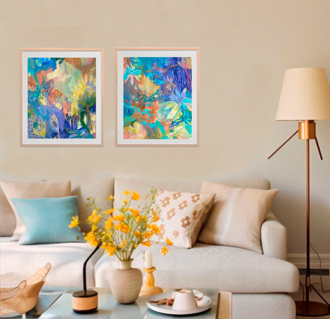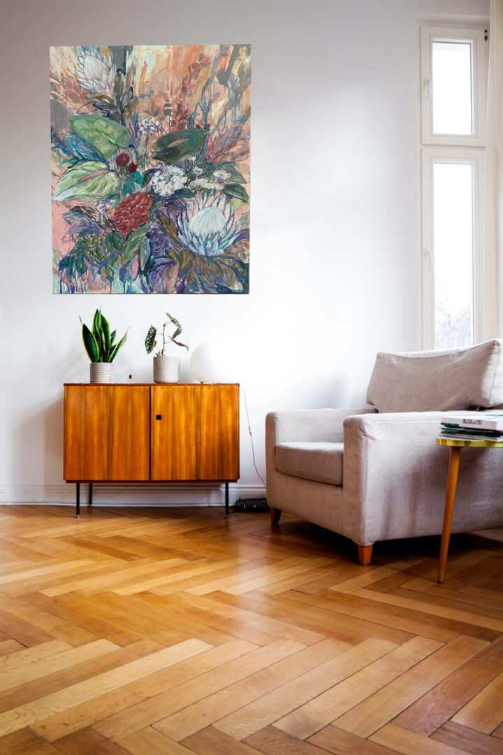 Hábilmente Lucía nos zambulle en su mundo de vibrantes colores y emocionales memorias botánicas. Rodeados de bouquets florales voluptuosos y complejos, creeremos reconocer flores de azahar, violetas, lilas, jacintos, jazmines o proteas entrelazadas en una sinfonía embriagadora.